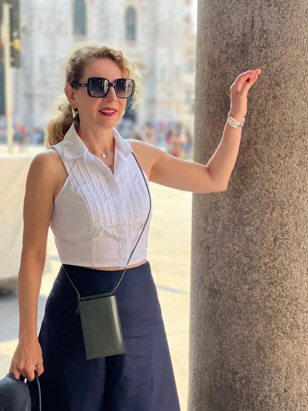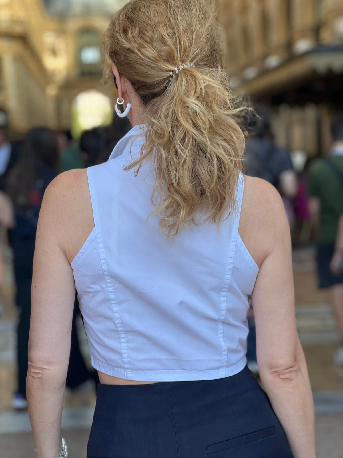 The Midnight Edge is a bold fusion of timeless elegance and modern edge. Designed with sleek trim detailing along the front. This sleeveless button-up adds a refined touch to any wardrobe. Designed to highlight the waist, perfect for high-rise bottoms.