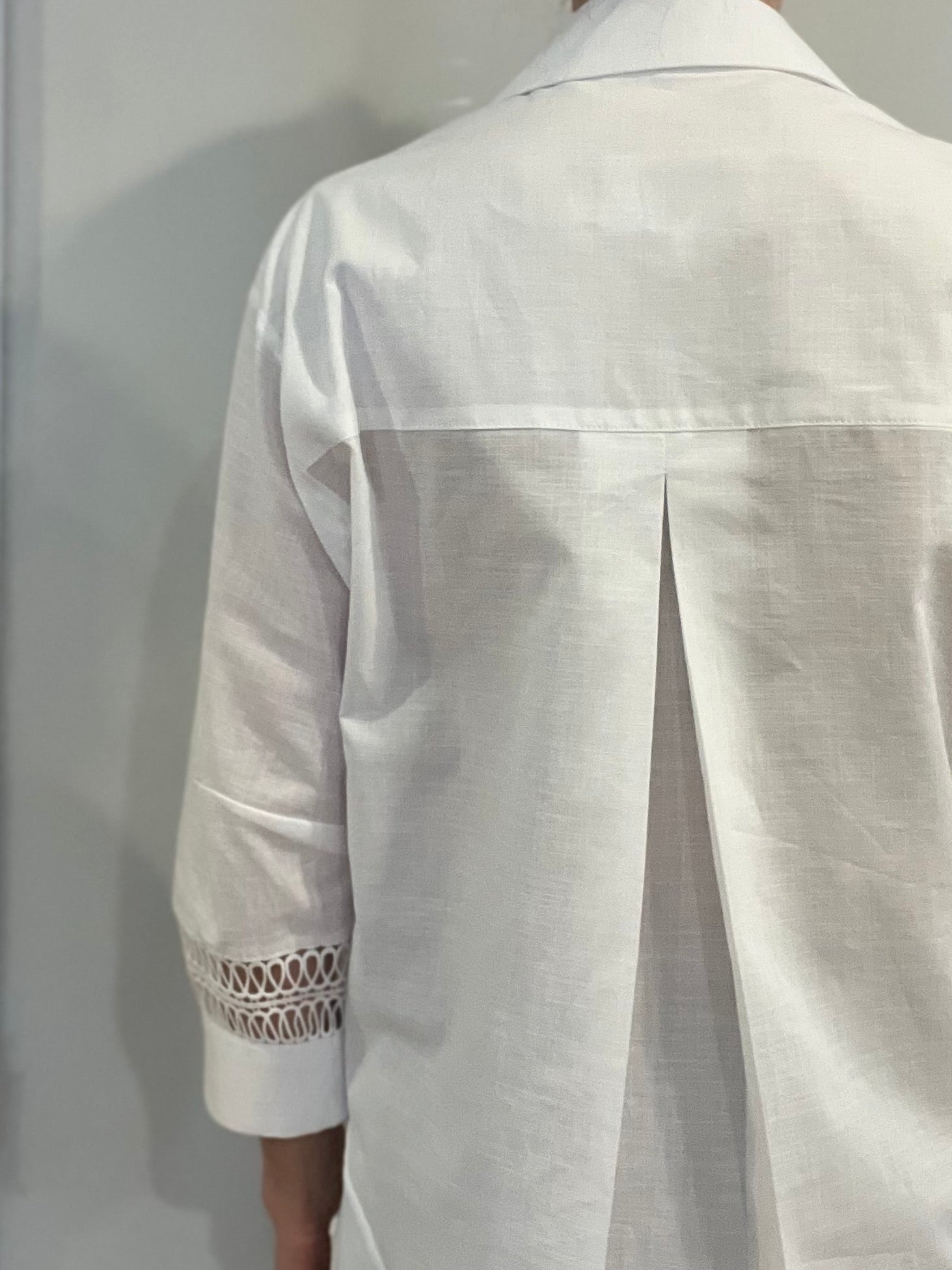 Crafted from a lightweight, breathable cotton fabric, this shirt features a relaxed, tailored silhouette with a classic collar and soft drape. Intricate open-lace panels at the shoulders and sleeves add an elegant touch, offering subtle texture and airy sophistication. The three-quarter sleeves are finished with matching lace insets for a cohesive, stylish finish.